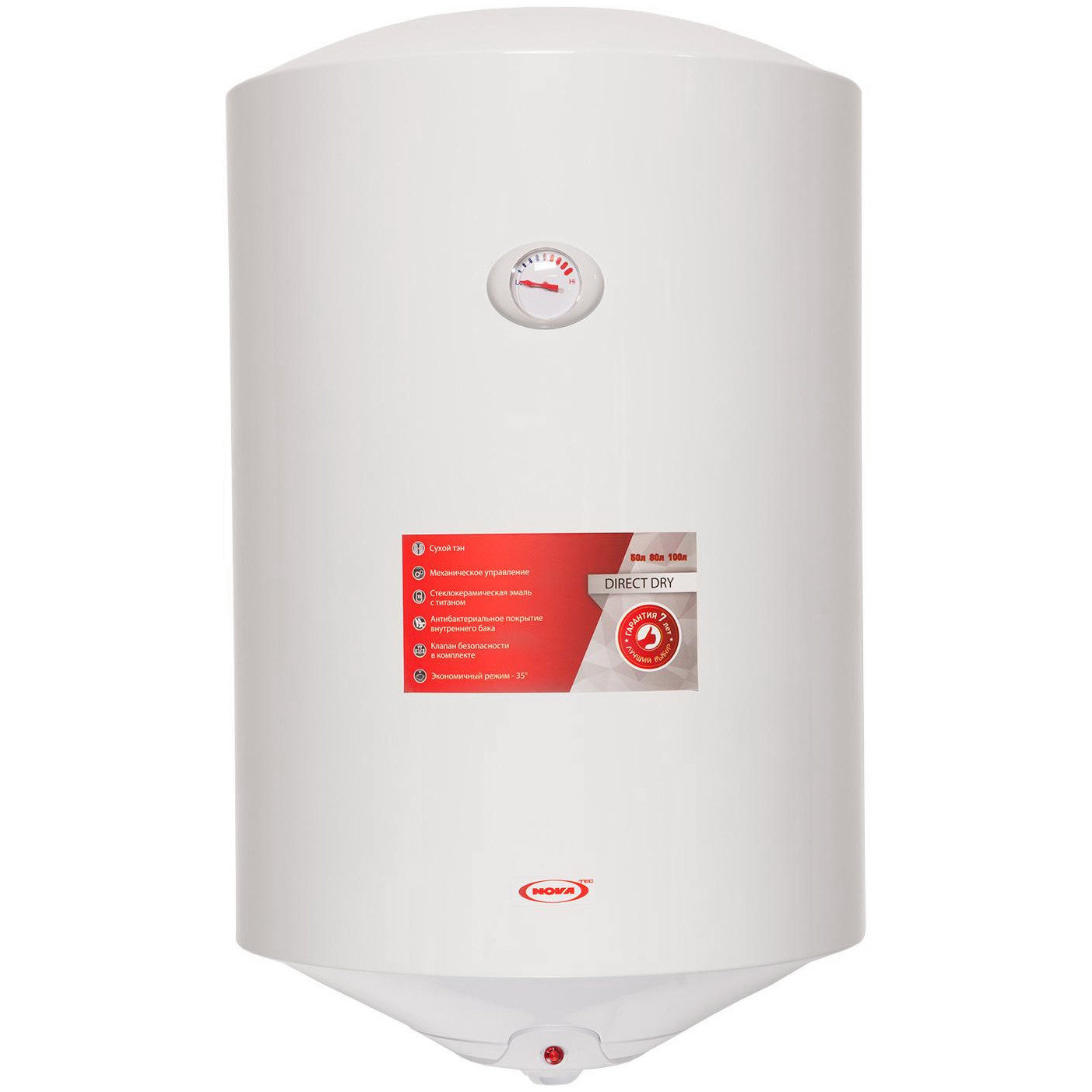 Водонагрівач Nova Tec NT-DD 100, що працює від мережі електроживлення, відноситься до типу накопичувальних моделей, які зуміють допомогти вирішити питання постійної подачі гарячої води, незалежно від центральної системи. Nova Tec NT-DD 100 має надійну і зносостійку конструкцію, що складається з корпусу круглої форми, розмірами 942х461х461 мм, і накопичувального бака з покриттям у вигляді титанової емалі, об'ємом в 100 л. Такий водонагрівач Ви зможете встановити в будь-якому зручному для Вас місці у вертикальному положенні з нижньою підводкою труб. Не можна не відзначити, що працює він на основі двох нагрівальних елементів сухого типу потужністю 0,8 кВт кожен. Максимального показника температури Nova Tec NT-DD 100 досягає при значенні 77 градусів, відстежити яке допоможе стрілочний термометр.