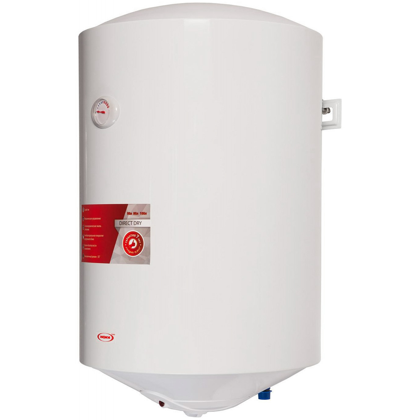 Встановивши такий електричний накопичувальний водонагрівач, як Nova Tec NT-DD 80, ви досить швидко зможете оцінити всі його переваги. Nova Tec NT-DD 80 має якісно виконану конструкцію з добре продуманими деталями, яка призначена для настінного типу монтажу у вертикальному положенні з нижньою підводкою труб. При відносно невеликих розмірах 761х461 мм і круглій формі об'єм баку бойлера становить 80 л, а час нагрівання до 65 градусів при початковій температурі води 15 градусів становить не більше 195 хв. Варто також звернути увагу на ефективність елементів нагрівання у вигляді двох незалежних ТЕНів, потужністю в 0,8 кВт кожен, а також можливість використання функції прискореного нагрівання. Є в Nova Tec NT-DD 80 і такі важливі деталі, як механічне управління, стрілочний термометр і магнієвий анод із захистом від перегріву і запобіжним клапаном.