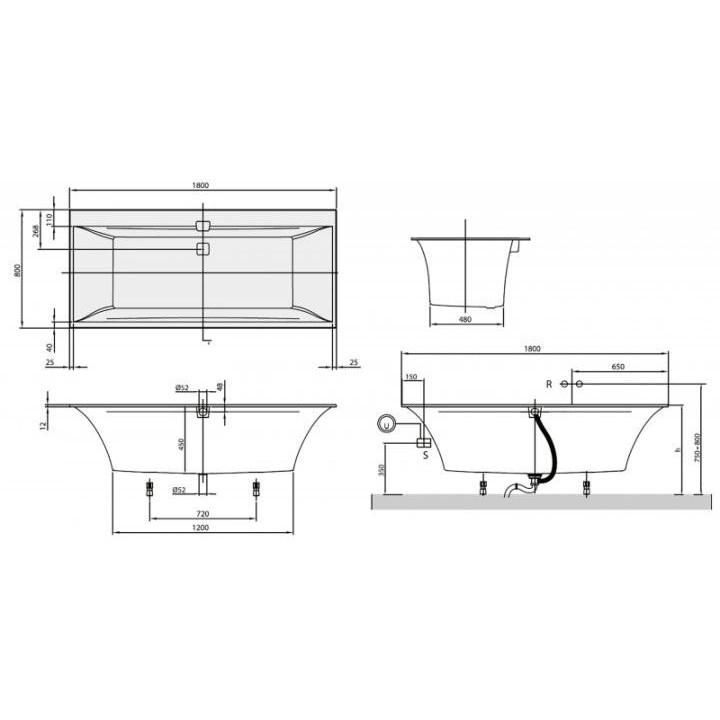 ванна, подовжений злив-перелив, комплект самоклеящихся ніжок